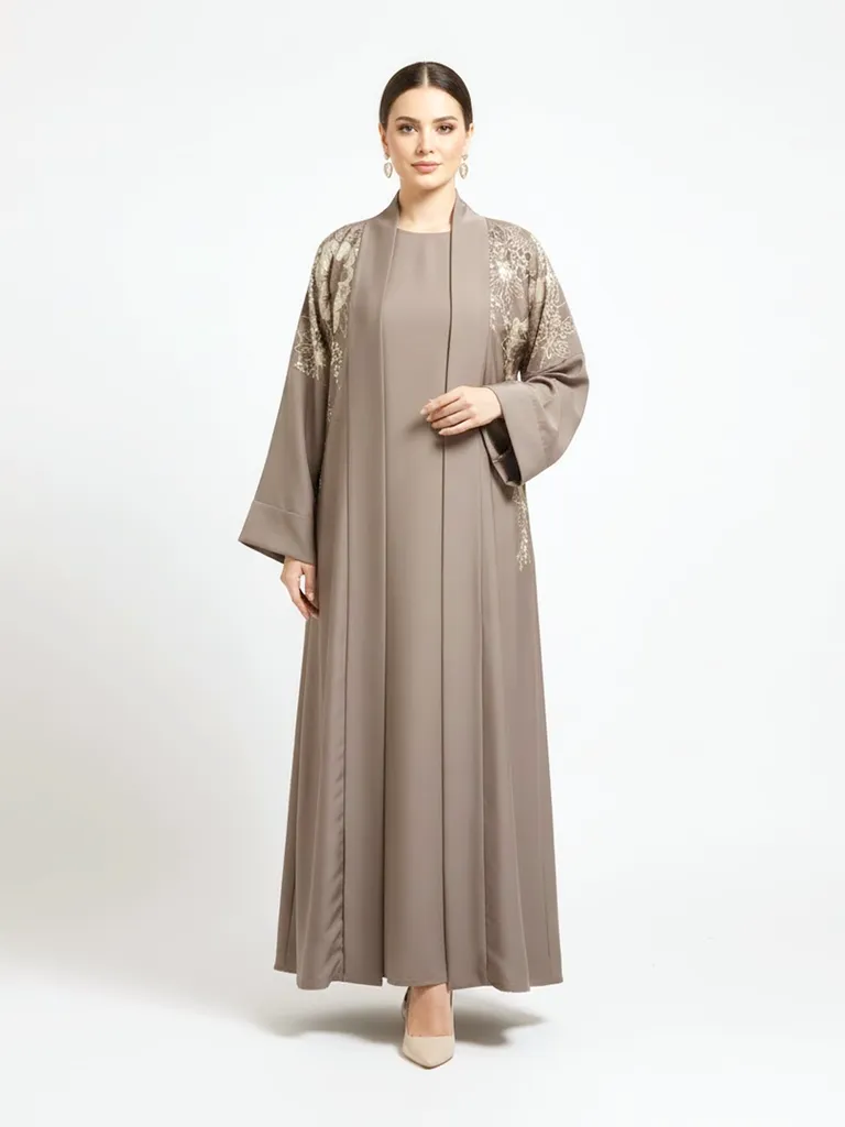 2 Pieces Premium Khaki Open Abaya Set With Inner Elegant Floral Embroidery Casual Muslim Abaya Dress