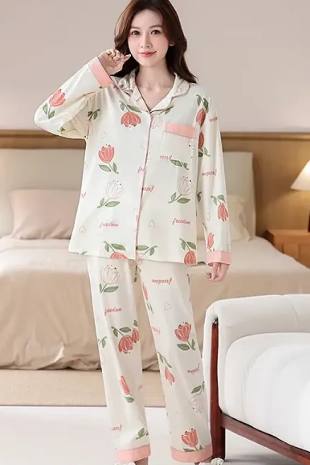 Cozy Womens Pajama Set Floral Printed Lounge Pajama Two Pieces Set