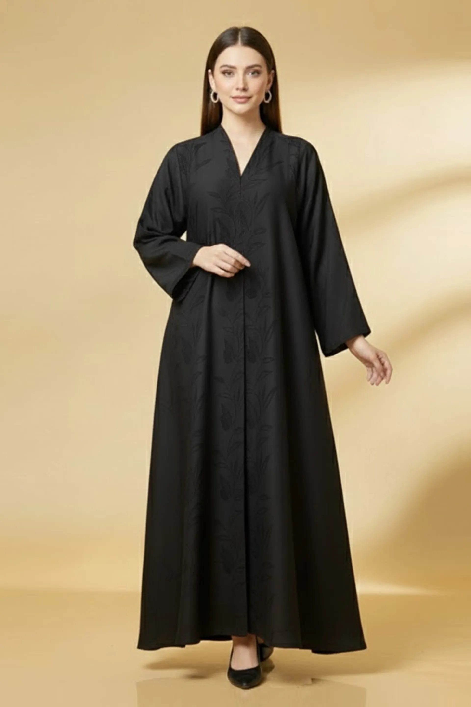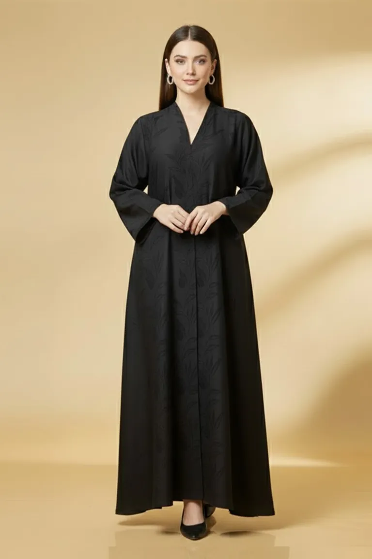 Noir Leaf-print Abaya Classic Tonal Embroider V-neck Long Sleeve Muslim Arabic Black Abaya