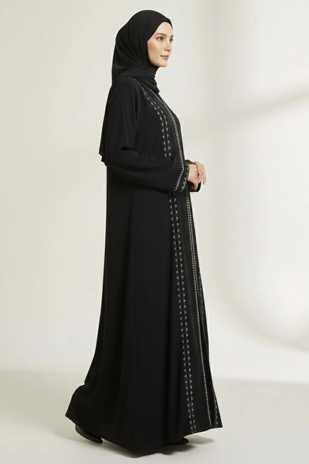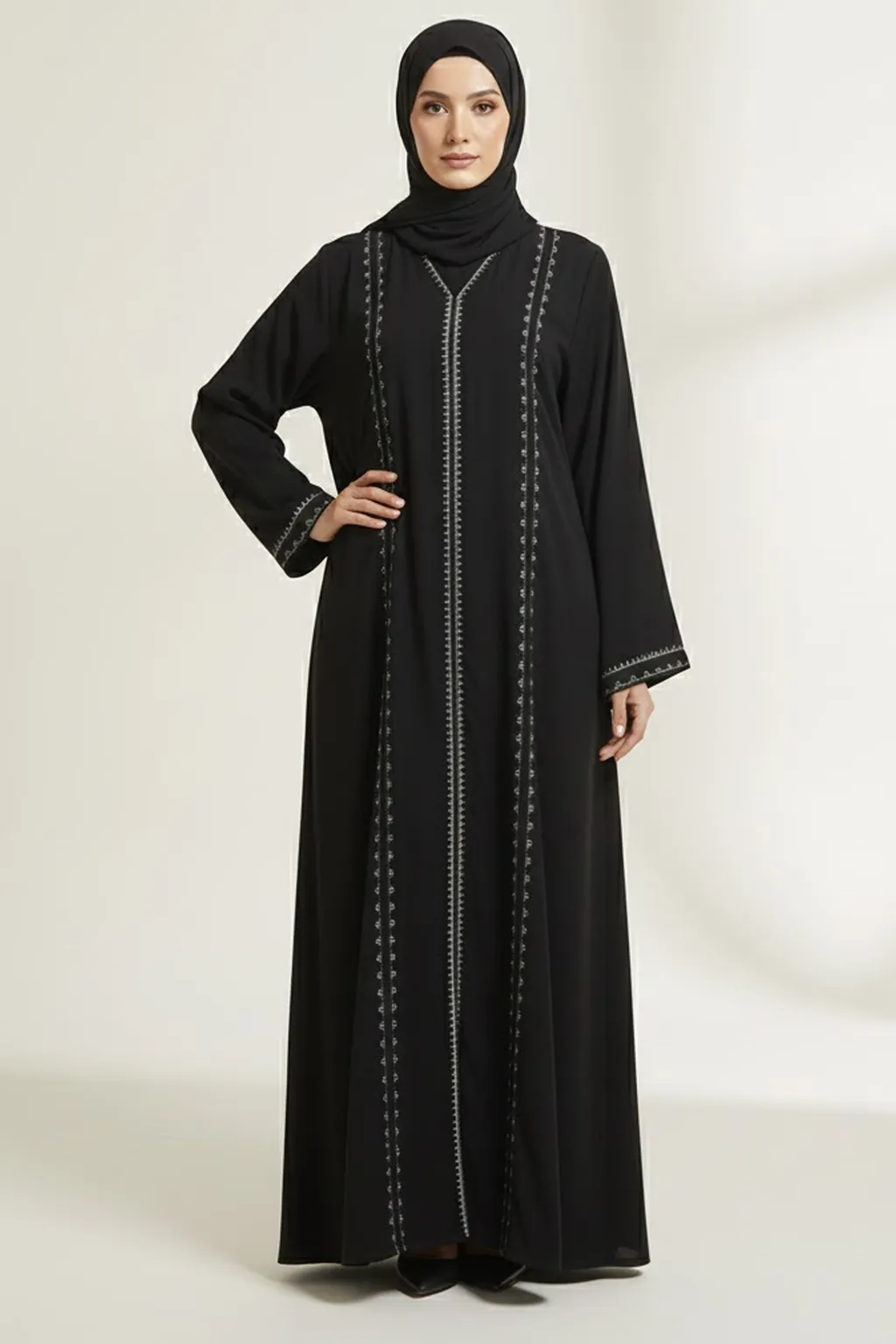 Premium Black Abaya With Front Embroidery Rhinestone Modern Modest Wear V-neck Long Sleeve Dress